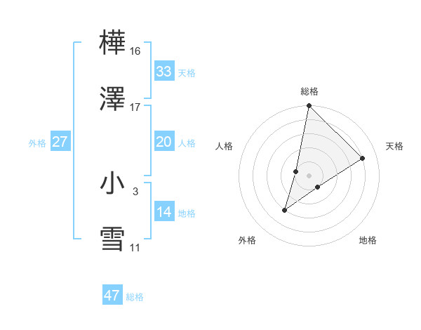 樺澤 小雪さんを姓名の画数から五運を鑑定