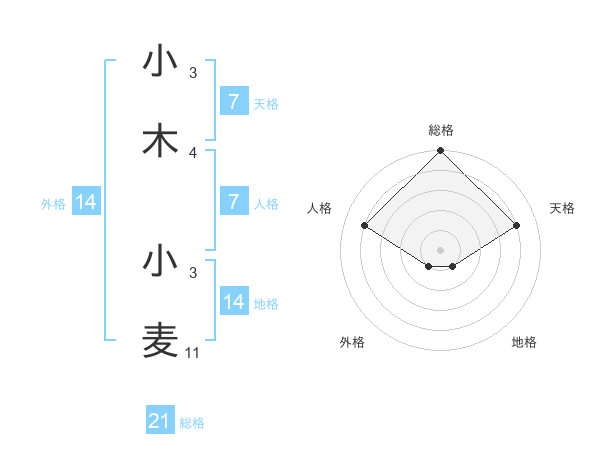 小木 小麦さんの総格は21画の5点!