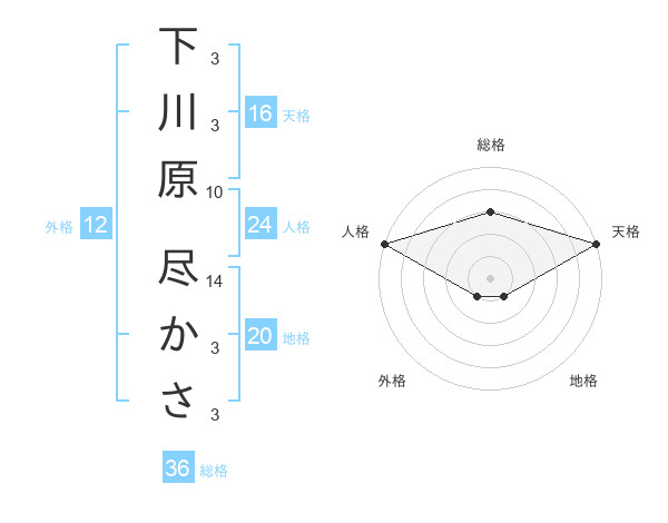 下川原 尽かささんの天格は16画の5点