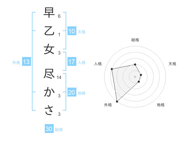 早乙女 尽かささんの総格は30画の2点