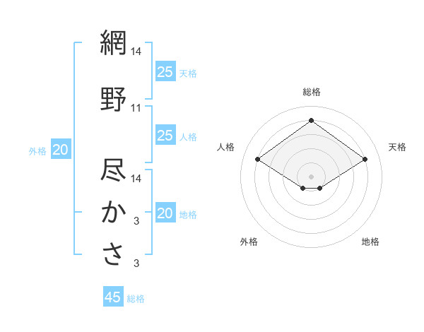 占い結果は姓名判断である以上、良い場合も悪い場合もありますが、決してお名前を誹謗中傷するものでなく、画数の自動計算によって得られたものです。また、本サイトの検索によって得られた鑑定結果で、第三者を誹謗中傷したり名誉を棄損するような行為を禁じます。