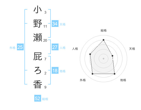 小野瀬 屁ろ香さんの総格は52画の4点!