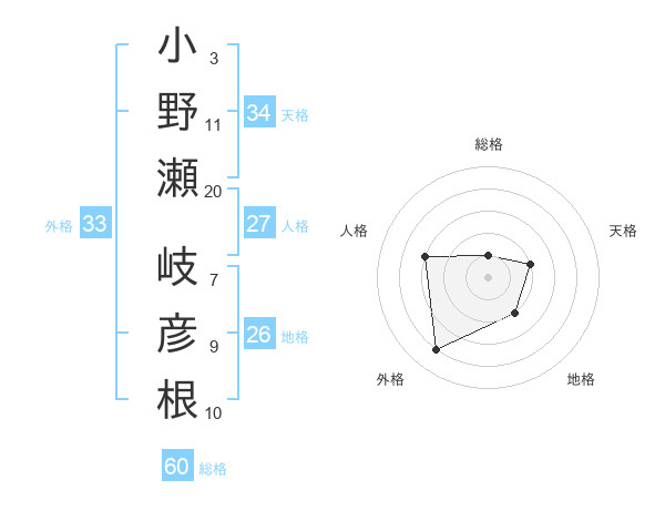 小野瀬 岐彦根さんの総格は60画の1点!