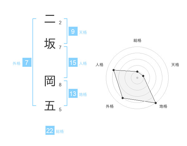 二坂 岡五さんの総格は22画の1点!