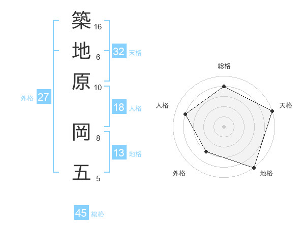 築地原 岡五さんの総格は45画の4点!