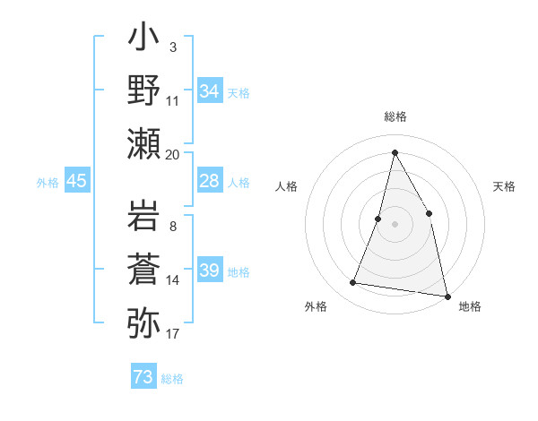 小野瀬 岩蒼弥さんの総格は73画の4点!