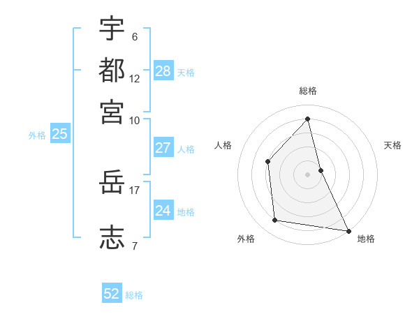 宇都宮 岳志さんを姓名の画数から五運を鑑定
