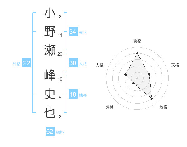 小野瀬 峰史也さんの総格は52画の4点!