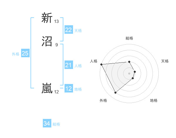 新沼 嵐さんの総格は34画の2点!