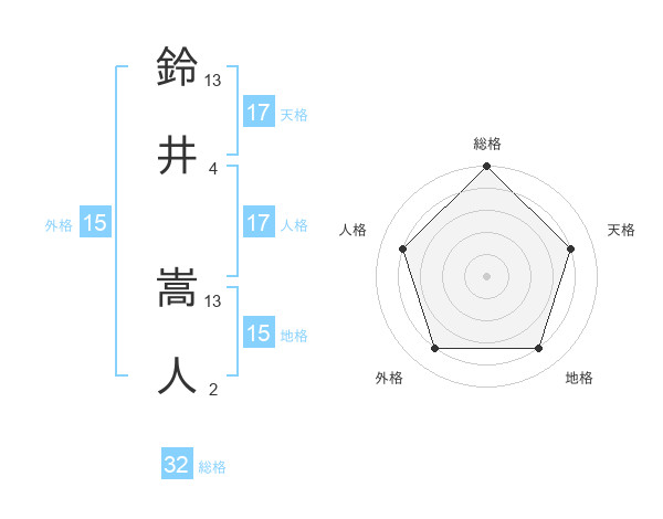 鈴井 嵩人さんの総格は32画の5点!