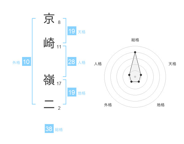 京崎 嶺二さんの総格は38画の4点!