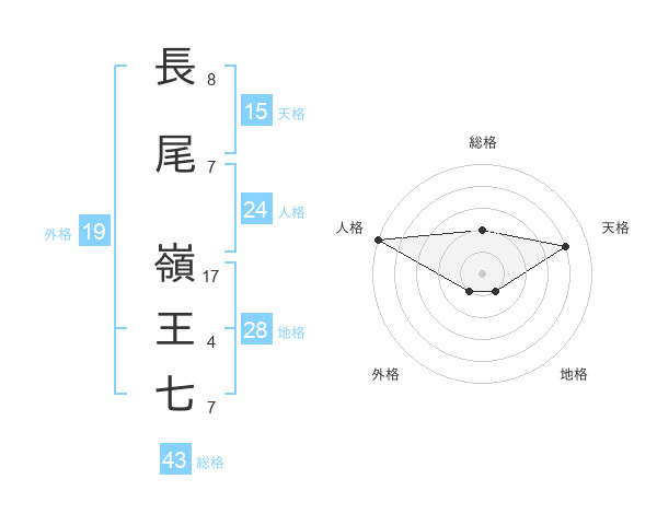 長尾 嶺王七さんの総格は43画の2点!
