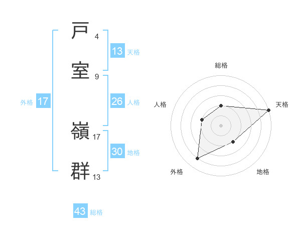 戸室 嶺群さんの総格は43画の2点!