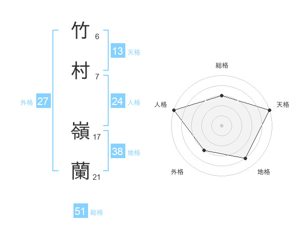竹村 嶺蘭さんの総格は51画の3点!