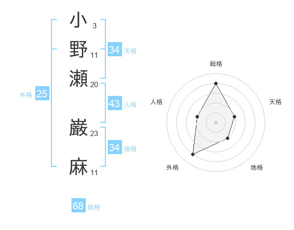 小野瀬 巌麻さんの総格は68画の4点!