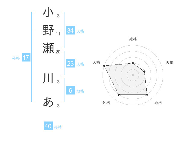 小野瀬 川あさんを姓名の画数から五運を鑑定