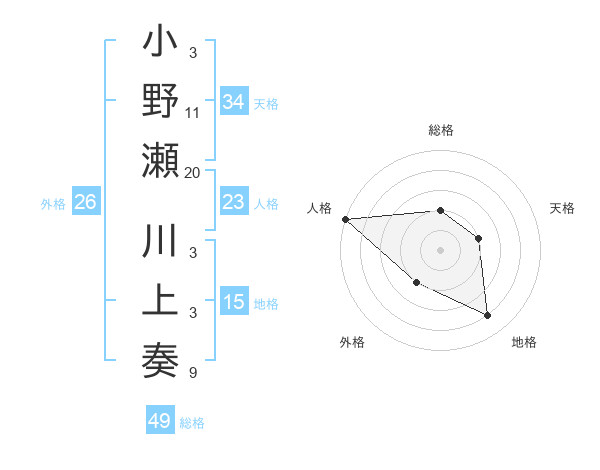 小野瀬 川上奏さんを姓名の画数から五運を鑑定