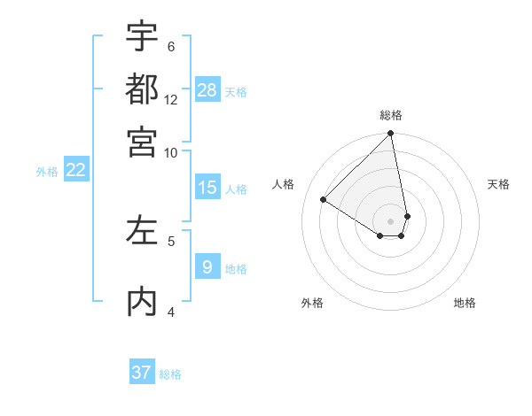 宇都宮 左内さんの総格は37画の5点!