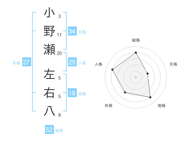 小野瀬 左右八さんの総格は52画の4点!