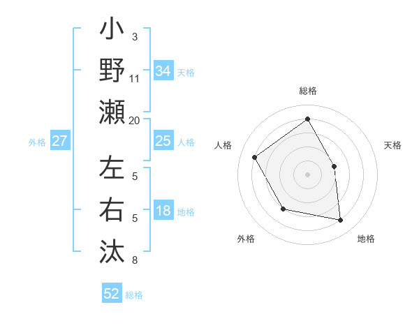 小野瀬 左右汰さんの総格は52画の4点!