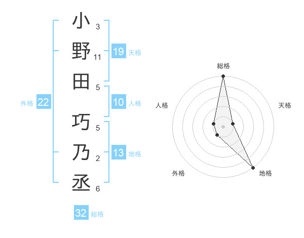 小野田 巧乃丞さんの総格は32画の5点!