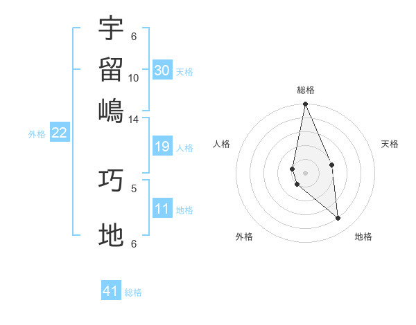 宇留嶋 巧地さんを姓名の画数から五運を鑑定