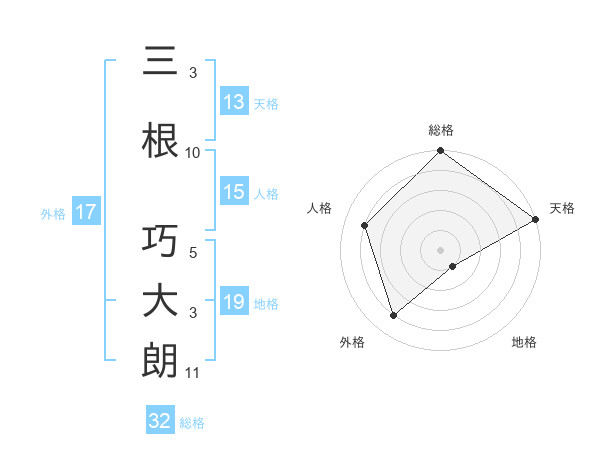 三根 巧大朗さんを姓名の画数から五運を鑑定