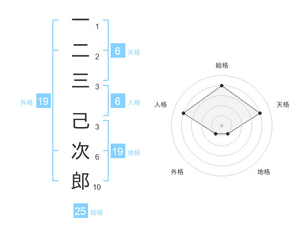 一二三 己次郎さんの総格は25画の4点!
