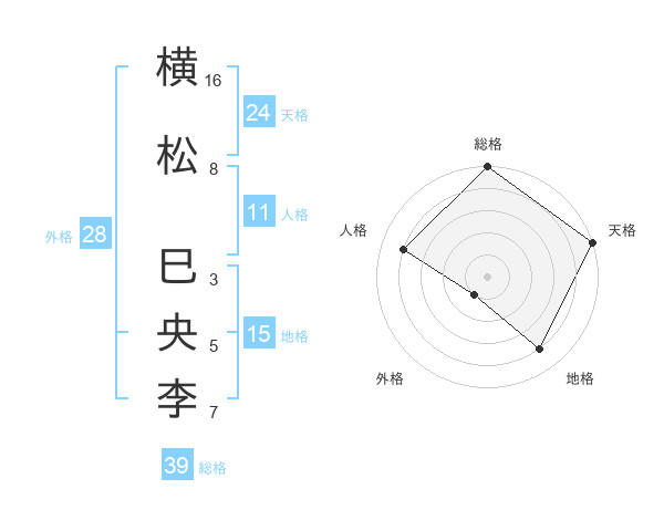 横松 巳央李さんの総格は39画の5点!