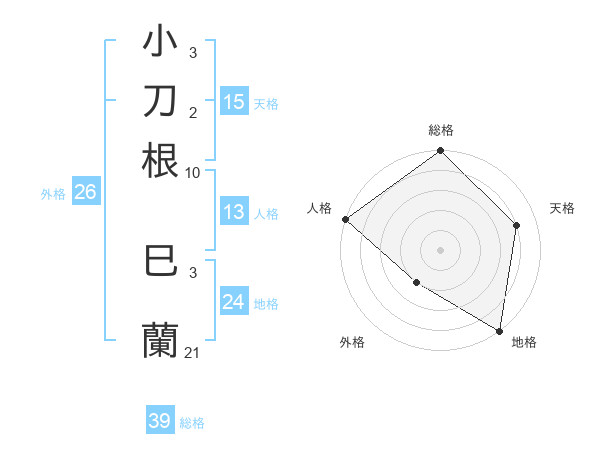 小刀根 巳蘭さんの総格は39画の5点!