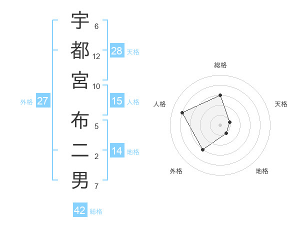 宇都宮 布二男さんを姓名の画数から五運を鑑定
