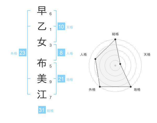 早乙女 布美江さんを姓名の画数から五運を鑑定