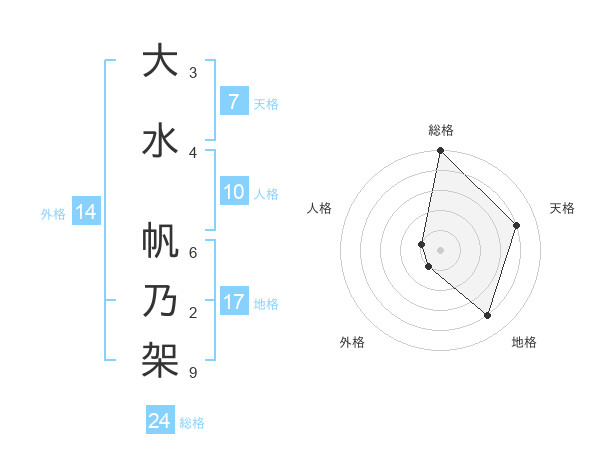 大水 帆乃架さんの総格は24画の5点!