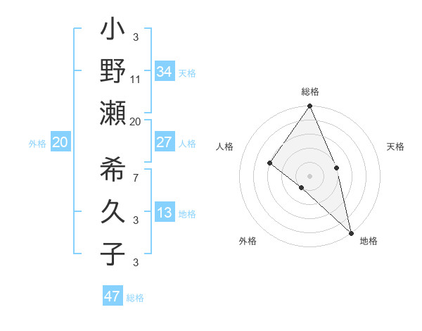 小野瀬 希久子さんを姓名の画数から五運を鑑定