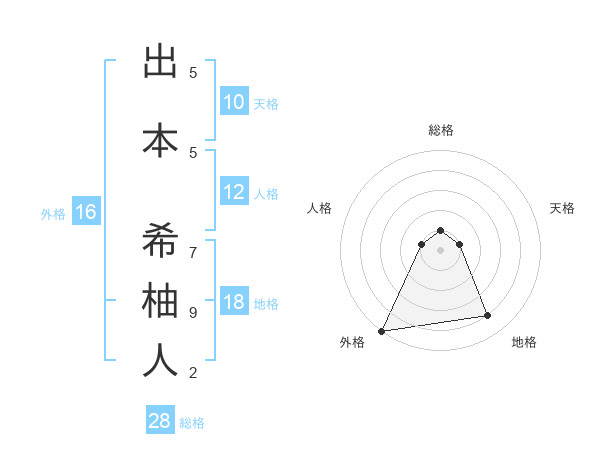出本 希柚人さんの外格は16画の5点!