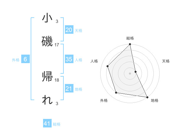 小磯 帰れさんを姓名の画数から五運を鑑定