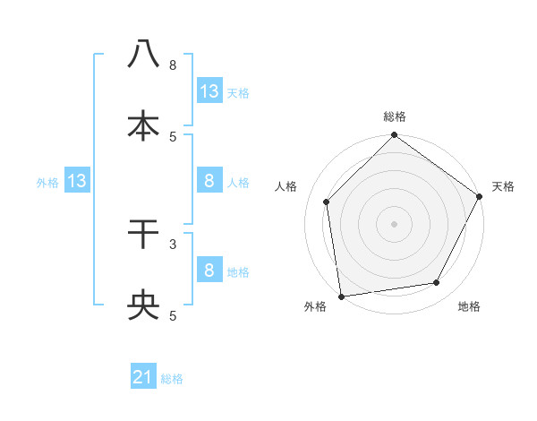 八本 干央さんの総格は21画の5点!