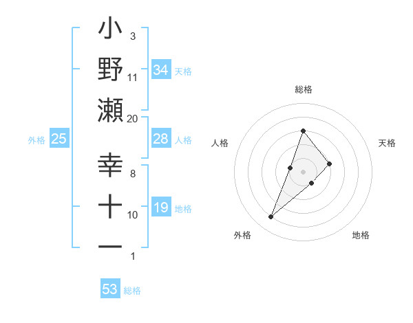 小野瀬 幸十一さんの総格は53画の3点!