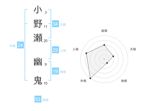 小野瀬 幽鬼さんを姓名の画数から五運を鑑定
