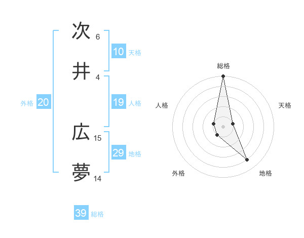 次井 広夢さんの総格は39画の5点!