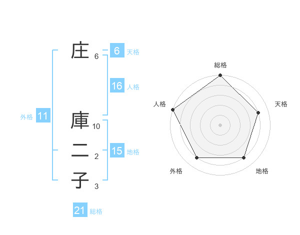 庄 庫二子さんの総格は21画の5点!