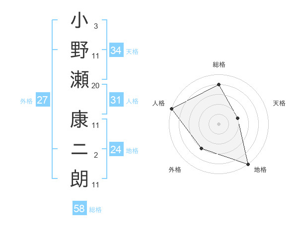 小野瀬 康ニ朗さんの総格は58画の4点!