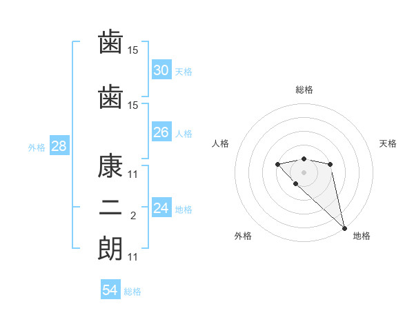 歯歯 康ニ朗さんの総格は54画の1点!