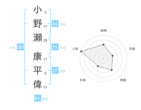 小野瀬 康平偉さんを姓名の画数から五運を鑑定