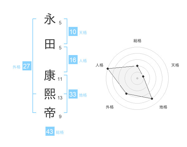 永田 康熙帝さんの総格は43画の2点!