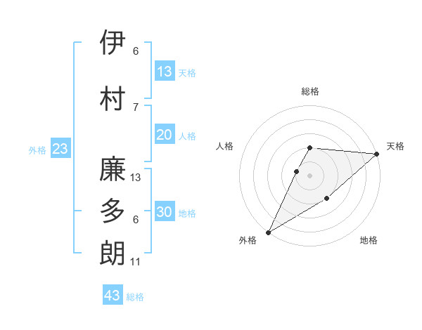 伊村 廉多朗さんの総格は43画の2点!
