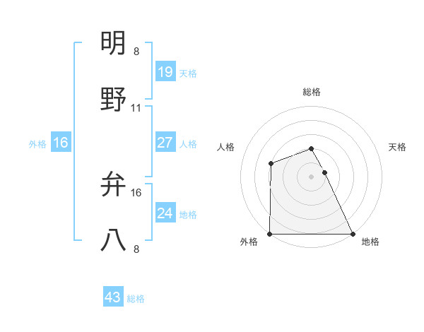 明野 弁八さんの総格は43画の2点!