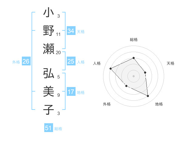 小野瀬 弘美子さんを姓名の画数から五運を鑑定