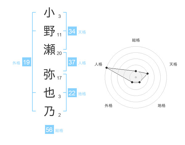 小野瀬 弥也乃さんを姓名の画数から五運を鑑定