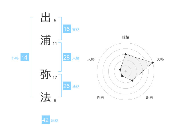 出浦 弥法さんを姓名の画数から五運を鑑定